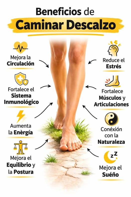 Caminar descalzo estimula terminaciones nerviosas que envían señales al cerebro, activando el sistema nervioso y mejorando la sensación de vitalidad.