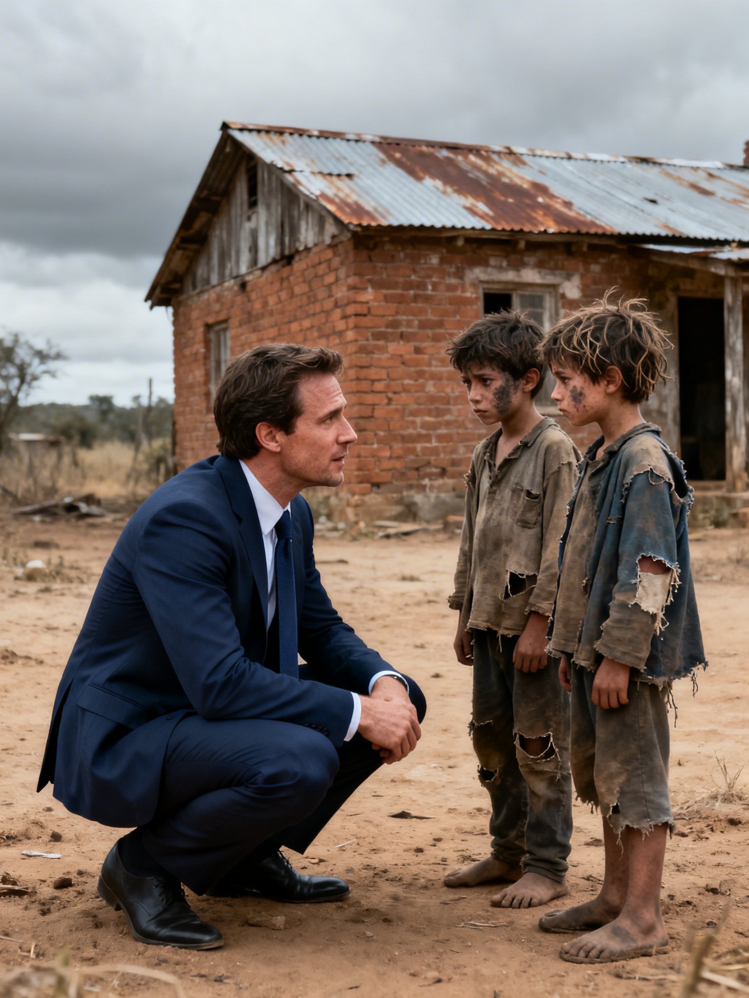 Con las manos temblorosas, ignorando la suciedad que mancharía su traje impecable, se agachó allí mismo, en la tierra roja, para quedar a la altura de ellos.