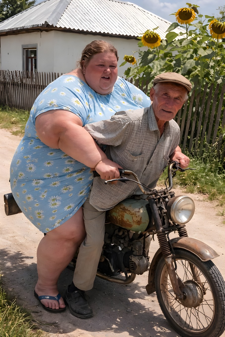 En la parte trasera viajaba una mujer joven, de unos treinta años, con un vestido azul estampado de margaritas, sujetándose con naturalidad, como si esa escena fuera lo más normal del mundo.