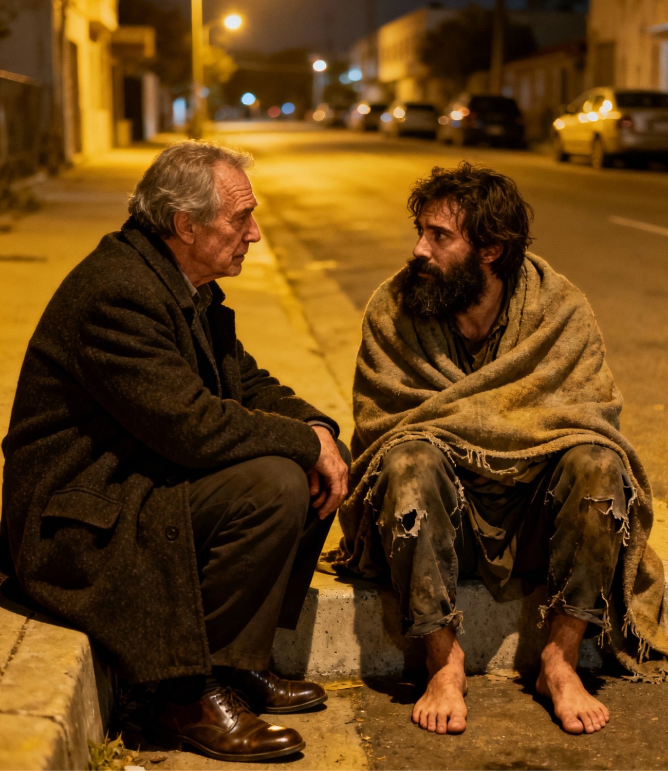Wayne abrochó su abrigo. El asistente subió el cuello. Al otro lado, a unos cincuenta metros, el hombre estaba sentado, sin zapatos, sin abrigo, solo harapos.
