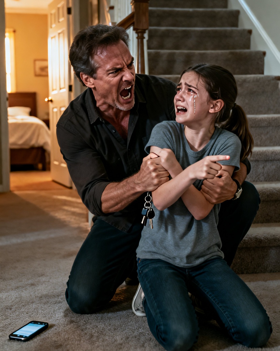 Emma levantó el brazo y señaló hacia arriba, con dedos temblorosos. «No tenemos tiempo. Tenemos que irnos de esta casa ya».