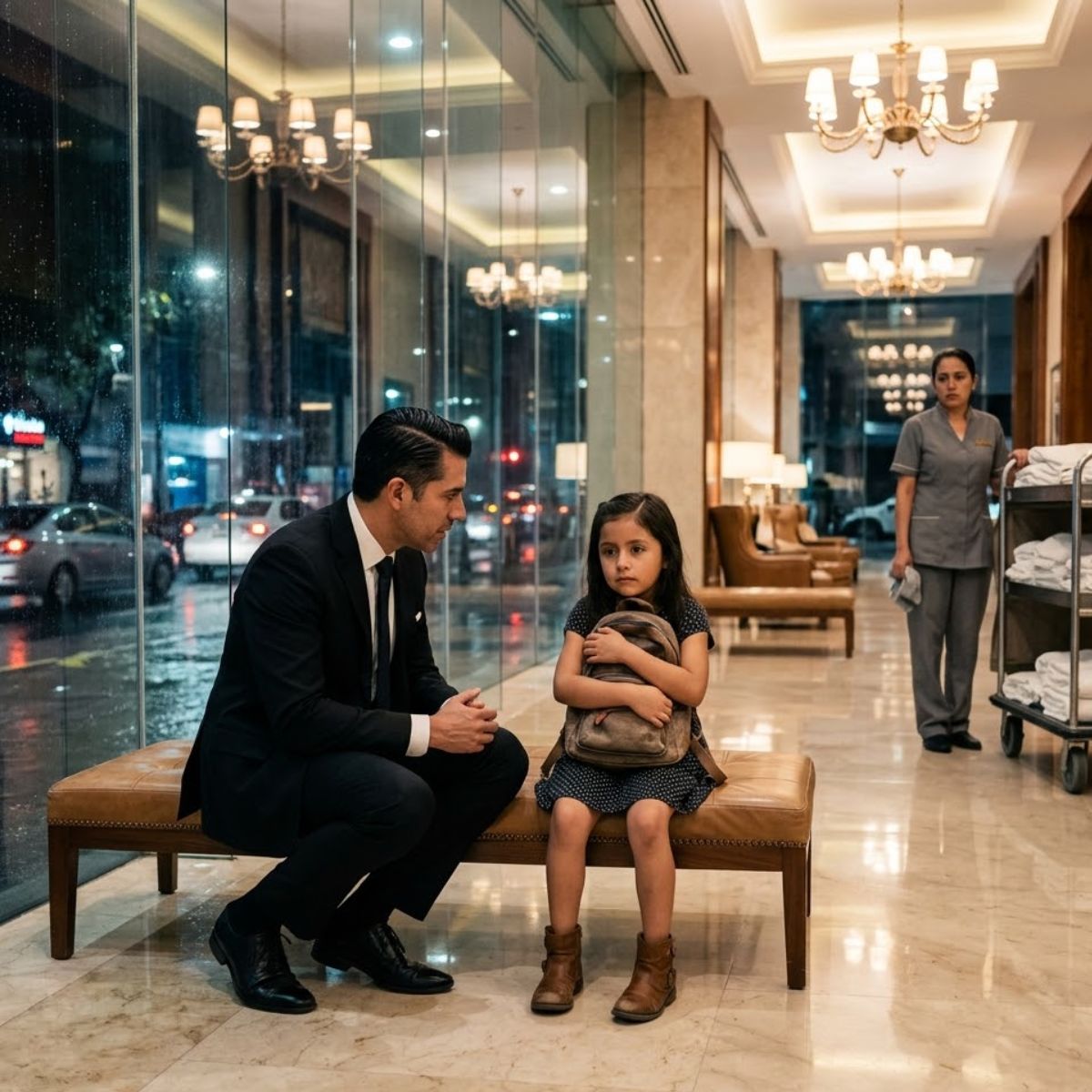 Era pasada la medianoche. Afuera, la lluvia golpeaba la ciudad con esa furia pareja que vuelve borrosos los coches, los anuncios y hasta las promesas. Adentro, todo era lujo: pisos de mármol, lámparas color miel, flores frescas en jarrones enormes, recepcionistas impecables y huéspedes que caminaban deprisa fingiendo no ver lo que no les correspondía.
