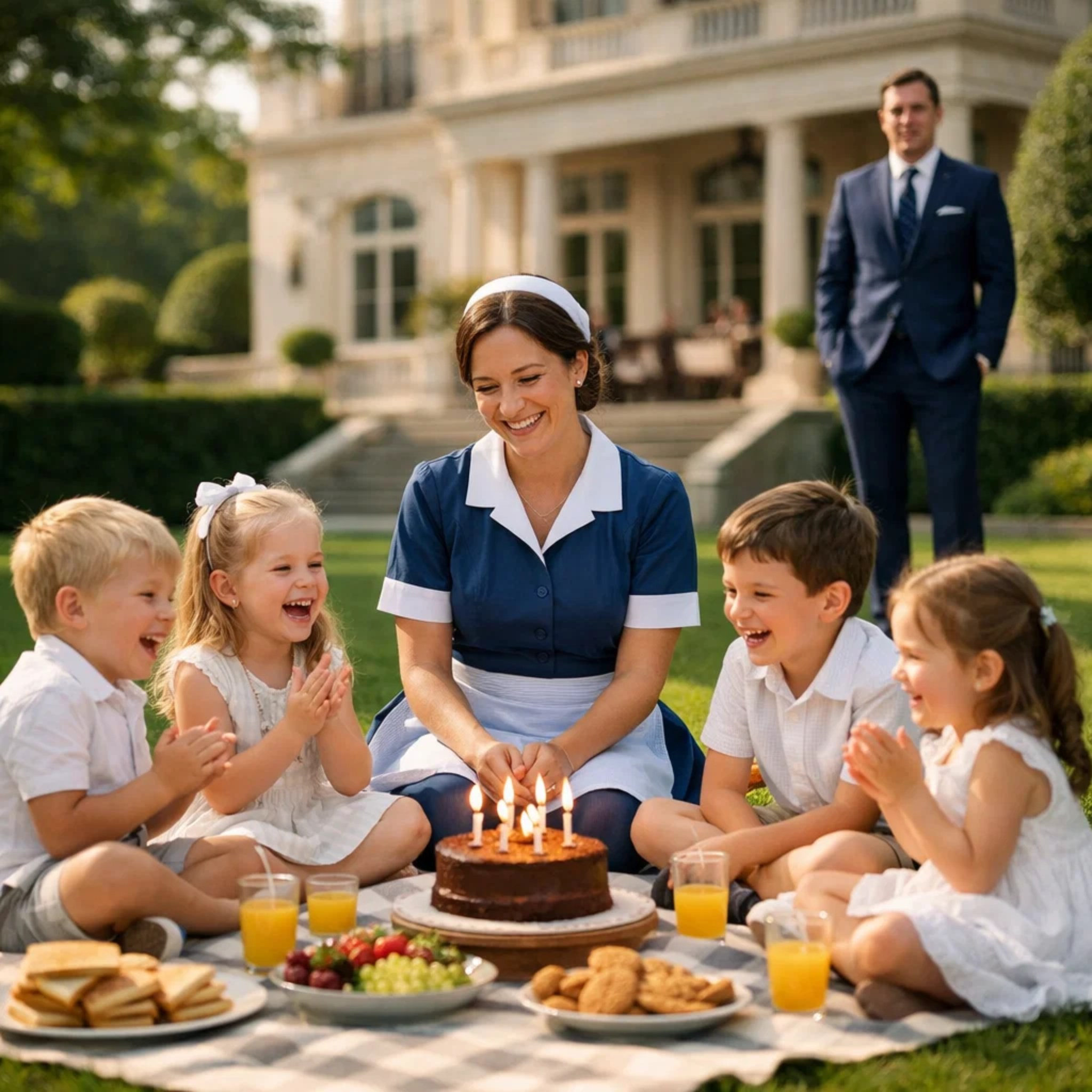 Al salir a la terraza, lo invadió el aroma a hierba y azúcar. En el césped había una pequeña mesa de madera cubierta con un mantel rojo a cuadros. Un pastel casero estaba ligeramente inclinado hacia un lado, con las velas encendidas con la brisa del atardecer. Cuatro niños pequeños con camisas azules iguales rodeaban la mesa, riendo y chocando los hombros, con las caras pegajosas por el glaseado. En el centro, una mujer con un delantal desteñido aplaudía suavemente para mantener el ritmo mientras cantaba una canción de cumpleaños con voz suave.