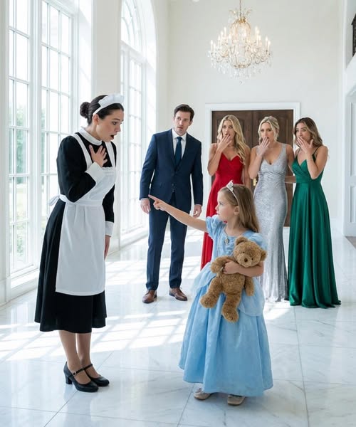 La pequeña Sophie Whitmore estaba de pie en medio del suelo de mármol, vestida con su vestido azul celeste, aferrando con fuerza su conejo de peluche contra su pecho.