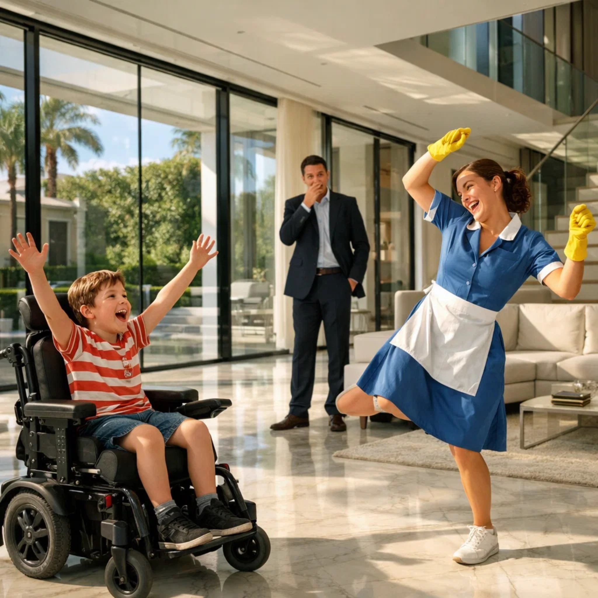 Oliver estaba en el centro de la sala, con su silla de ruedas describiendo lentos círculos. Una joven bailaba a su lado, exagerando cada paso, tambaleándose dramáticamente como si fuera a caerse.